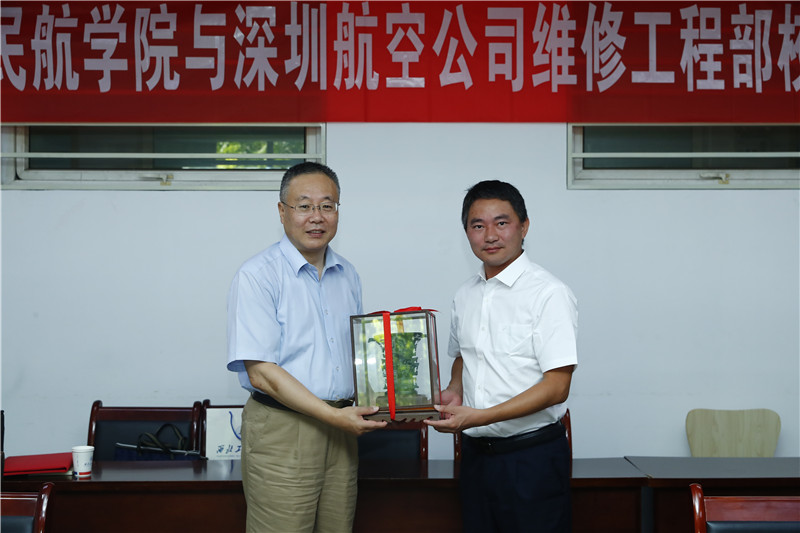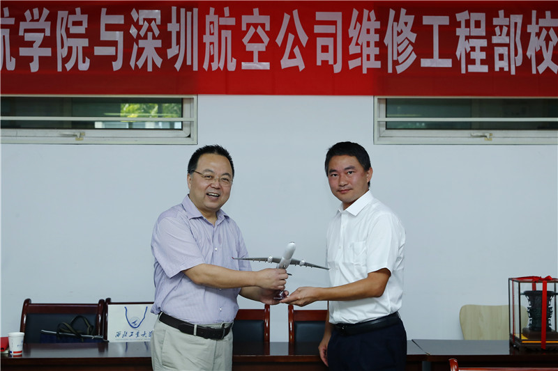 万小朋代表公司赠予深圳航空有限责任公司维修工程部“何尊”纪念品,方文兵代表深圳航空有限责任公司维修工程部赠送西工大伟德国际VICTOR1946深航飞机模型纪念品。