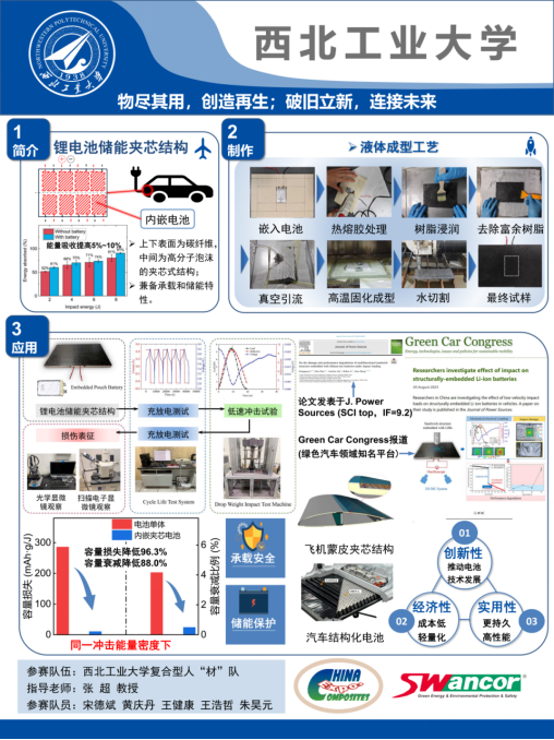 伟德国际VICTOR1946参赛作品“锂电池储能夹芯结构”旨在将能量存储和承载功能结合在一起,以提高能量储存效率和空间利用率,在相同冲击能量密度下,相比于不受保护的锂电池单体,该一体结构的容量损失减小了96%,容量衰减比例降低了88%,为未来交通工具和航空航天行业提供新型轻量化多功能结构方案。在成果展示环节,该作品的创新性、实用性、经济可行性得到了评委们的高度认可,最终,荣获创新应用奖二等奖。