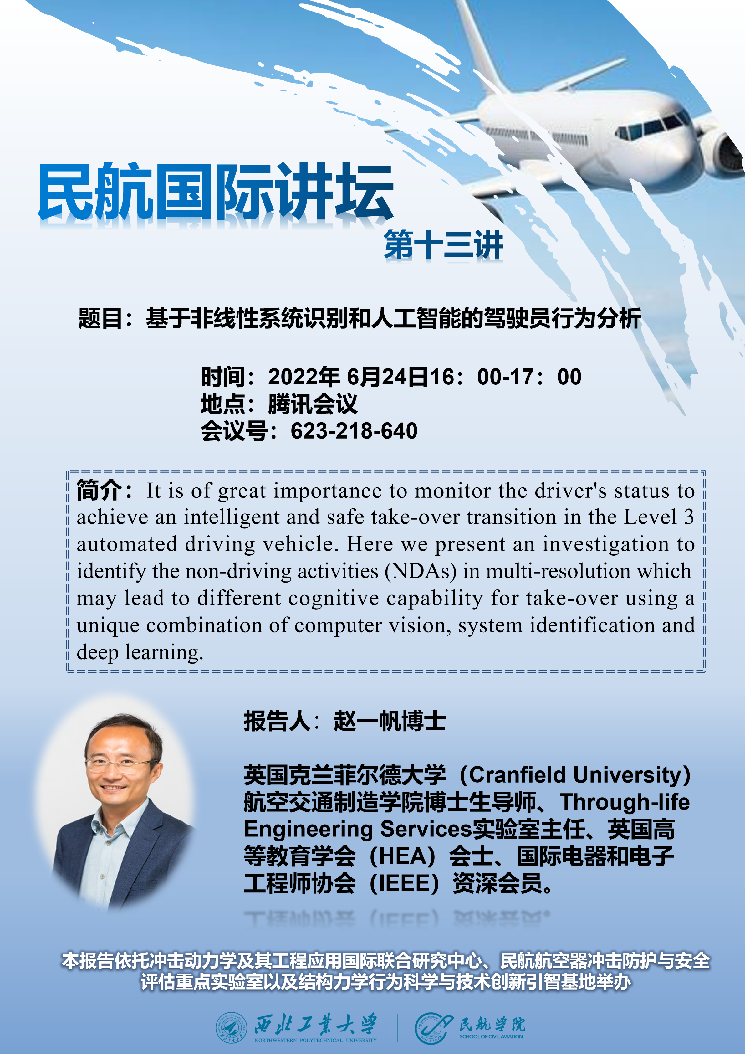 6月24日下午四点,公司拟线上举办“基于非线性系统识别和人工智能的驾驶员行为分析”专题讲座,届时欢迎各位老师同学参会交流。报告信息如下: