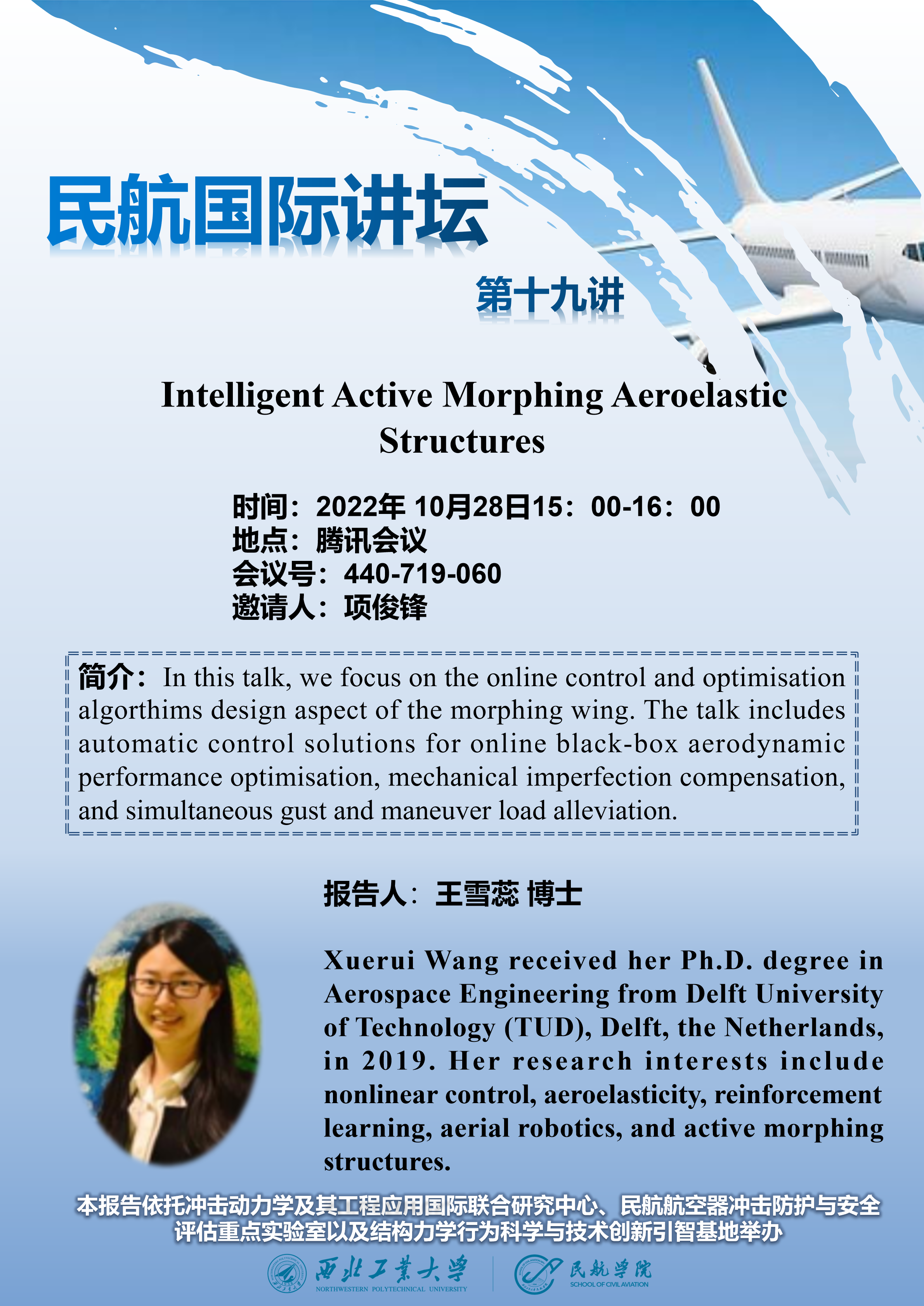 10月28号下午三点,公司拟线上举办“Intelligent Active Morphing Aeroelastic Structures”专题讲座,届时欢迎各位老师同学参会交流。以下是讲座详细信息: