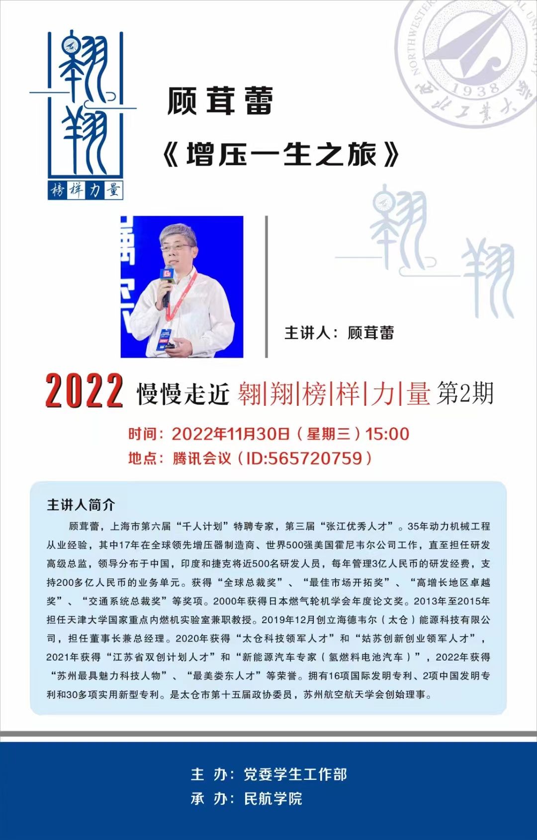 公司拟于2022年11月30日15:00点,线上举办“翱翔榜样力量”专题讲座,届时欢迎各位老师同学参会交流。以下是讲座详细信息: