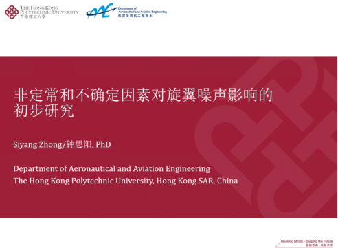 讲座中,钟思阳博士向与会的师生简要介绍了香港理工大学和航空及民航工程系的基本情况,然后结合他本人气动噪声的研究兴趣,重点介绍了城市空中交通领域旋翼飞行器降噪的背景与需求,以及近期在旋翼气动噪声理论建模与噪声预测问题中的突破与进展。钟思阳博士从气动噪声建模框架着手,介绍了考虑非定常和不确定因素的理论分析方法,讨论了转速波动、叶片振动等因素对噪声特性的影响,为实际复杂因素条件下的旋翼噪声精准预测提供了思路。
