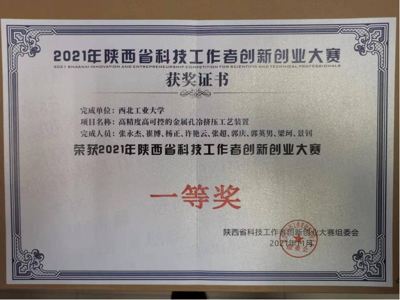 《高精度高可控的金属冷却挤压工艺装置》,作品完成人——张永杰、崔博、杨正、许艳云、张超、郭庆、郭英男、梁珂、景钊。