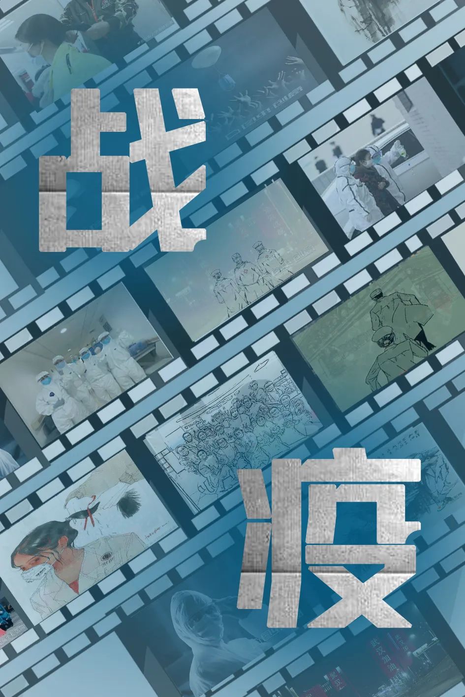 作品说明:海报收集了一些在“战疫”期间感人至深的画面:逆行者、建筑上的“武汉加油”、护士剪辫子、医务人员集体合影、口罩等等,并且以胶片的形式串联起来作为背景,特别突出有质感的“战疫”两字来表达一种坚定、必胜的信念,整体海报呈暗蓝色,象征着夹杂着感性的冷静。