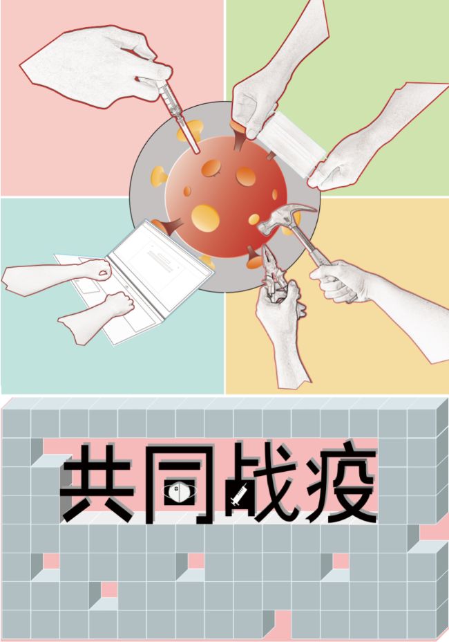作品说明:红色象征着危险,所以红色区块主体为战疫一线的医生,使用针管作为医生的象征。黄色代表着土地,也代表着在建筑工地运作的机械。绿色代表着生命,代表着畅通。蓝色代表天空,进而可以想象到云彩。各地员工及各行各业的工作者利用“云平台”在家中进行工作。背景立体方块代表着全国各地输送的物资,这些物资中蕴含的是全国各地的关心与爱,借助红色背景烘托这份感情。文字“共同战疫”中借助口罩和针头替代方块,再次强调“战疫”二字,并强调要积极进行防护和治疗。