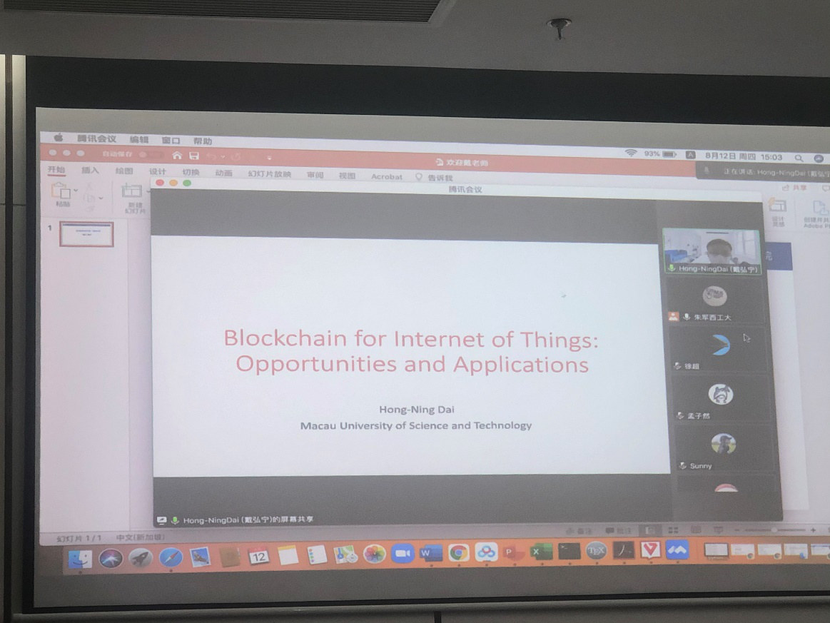 应伟德国际VICTOR1946朱军副教授邀请,澳门科技大学戴弘宁副教授于2021年8月12日下午15:00至18:00开展了题为“Blockchain for Internet of Things: Challenges, Opportunities, and Applications”的线上讲座,来自bv伟德国际1946、湖南大学、日本东京大学、英国兰卡斯特大学等高校的师生通过腾讯会议参与了本次讲座。此外,本次讲座在太仓长三角研究院设立了线下会场,来自伟德国际VICTOR1946、软件公司、微电子公司的20余名师生参加了此次讲座,并与主讲人进行了互动交流。