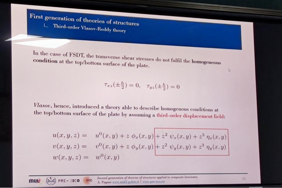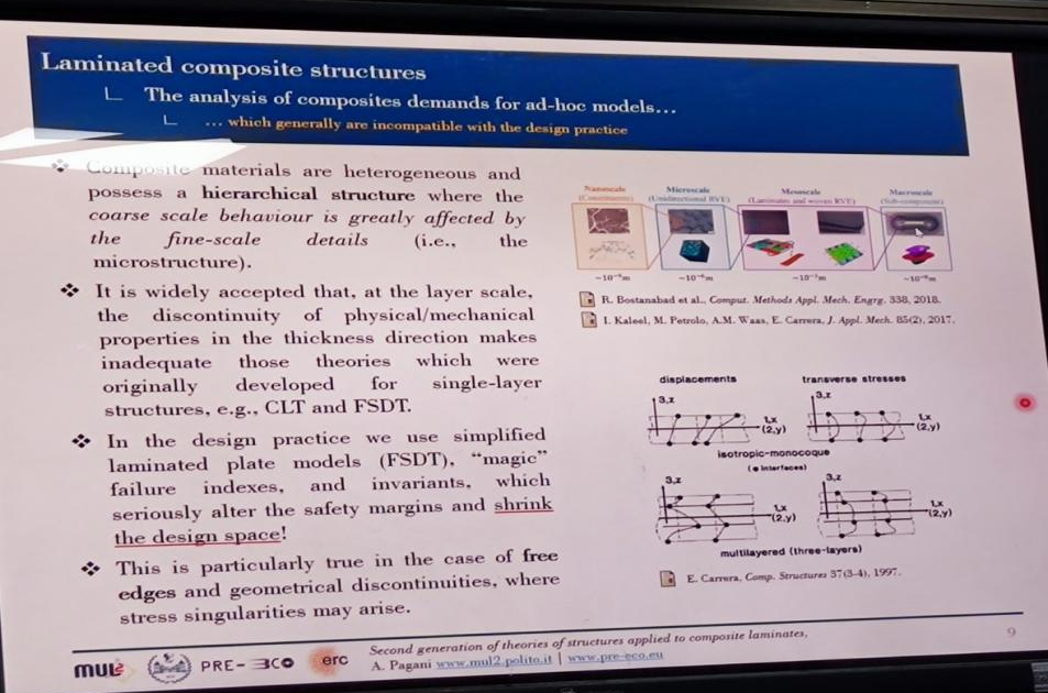 4月10日,Alfonso Pagani副教授为公司师生作了题为《Secondgeneration of theories of structures applied to compositelaminates》的专题报告。他结合对复合材料层合板结构等方面的研究,首先回顾了复合材料层合板的第一代结构理论,分析了其优势以及需要改进的不足之处。随后,介绍了正在探索的第二代结构理论,并提供了实现从微观到宏观尺度具有可扩展和高精度的高阶有限元的可能性。最后AlfonsoPagani副教授通过问答的形式,对层合板结构中的详细应力分析和失效行为、纤维增强复合材料的多尺度渐进失效、屈曲和后屈曲等方面,与线上师生做了沟通和交流。