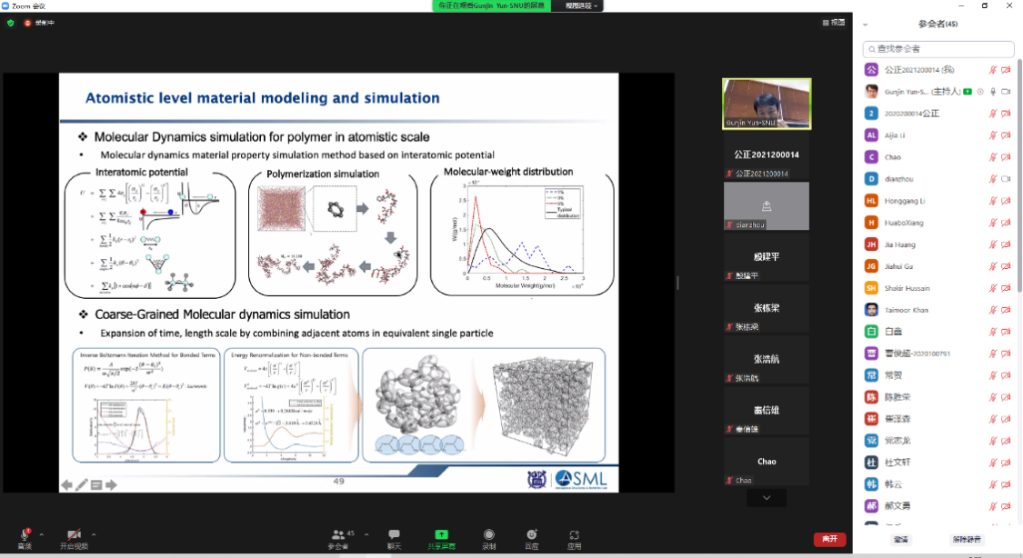 4月8日,Gun-JinYun教授为公司师生作了题为《Multiscalemodeling and analyses for compositematerials》的专题报告。他结合对复合材料多尺度建模和分析方面的研究,首先对经典的微观力学理论以及对微观模型均一化的分析技术和多尺度微观力学的一些建模与分析方法进行系统的概述。之后,Gun-JinYun教授通过多尺度建模与分析的实际案例对本次专题报告做了总结概括。