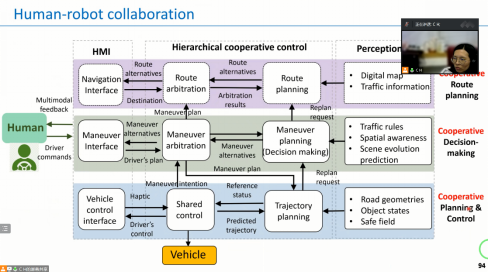 讲座中,黄超教授简要介绍了自动驾驶领域0-5级的自动化水平的标准界定。之后,她对纯无人驾驶中存在的故障诊断与容错控制、避碰路径规划,以及个性化决策等问题进行了系统性的讲解。重点介绍了其在人机共驾领域的学术与工程研究工作,包括共享控制、人机协同路径规划,以及驾驶员注意力估计等关键技术问题。