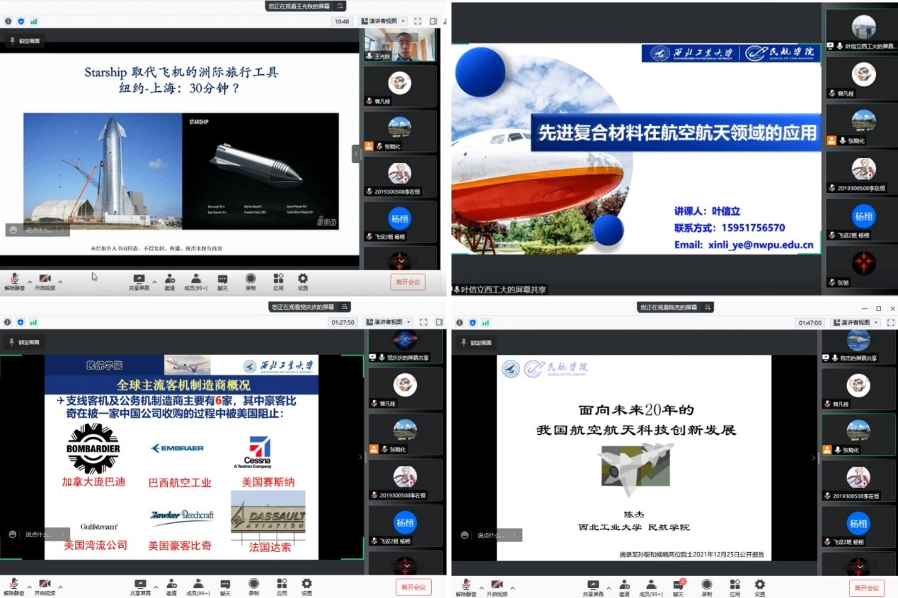为丰富本科生疫情期间的文化生活,拓展员工视野,激发学习热情,伟德国际VICTOR1946于2022年1月4日14:00,在腾讯会议线上举办了本科生系列讲座第一讲,近 200名本科生线上参加了讲座。“民用航空发动机设计理念与技术发展”、“先进复合材料在航空航天领域的应用”、“大飞机总体技术发展”、“航空航天未来二十年发展”先后由王光秋教授,叶信立副教授,党庆庆助理教授以及陈杰副教授主讲,公司教学副经理张晓化主持。
